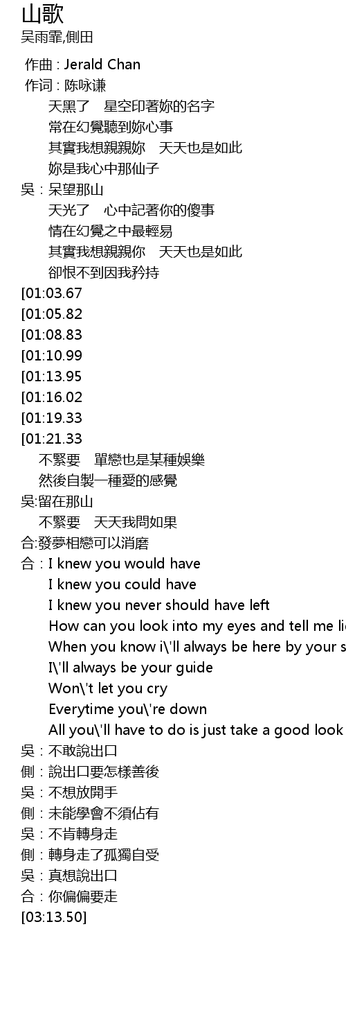 [02:10.20][01:05.82] ce: shuo chu kou yao zen yang shan hou