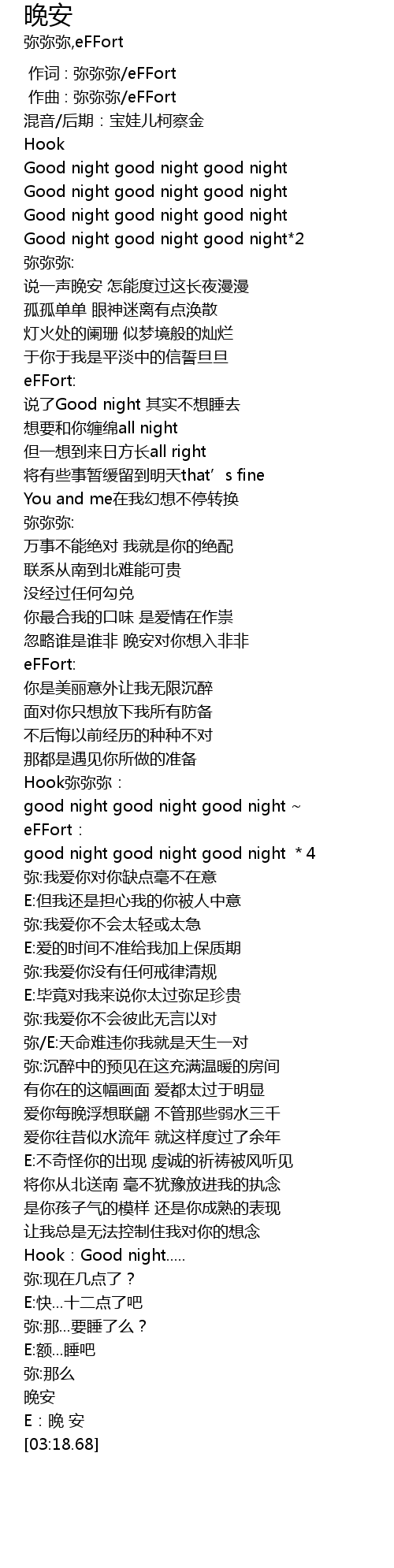| [00:56.21] | 说了Good night 其实不想睡去 |