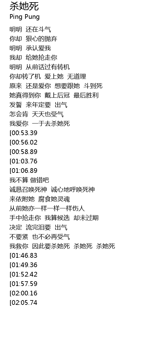 | [01:39.12] | wǒ jiù nǐ yīn cǐ yào shā tā sǐ shā tā sǐ shā tā sǐ |