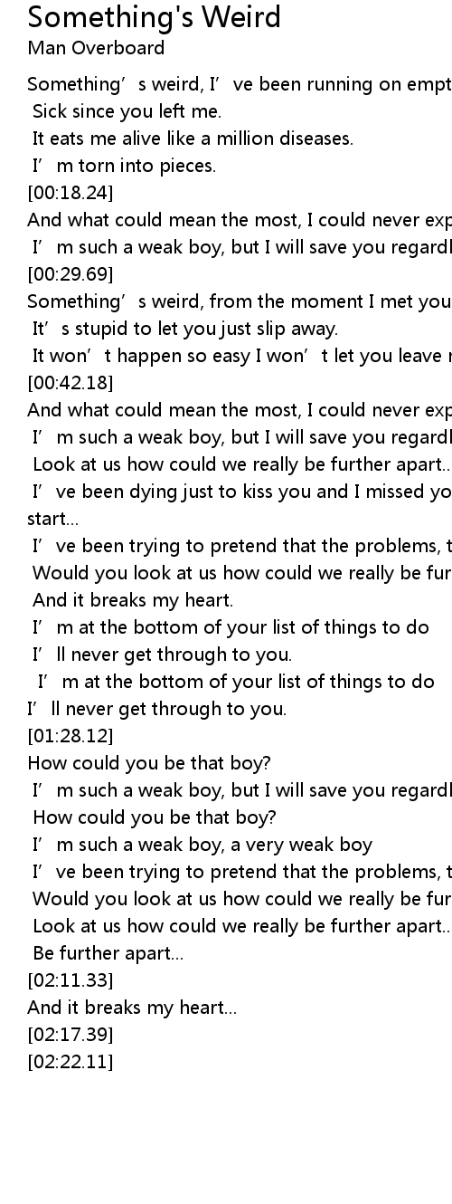| [00:06.33] | Something’s weird, I’ve been running on empty. |