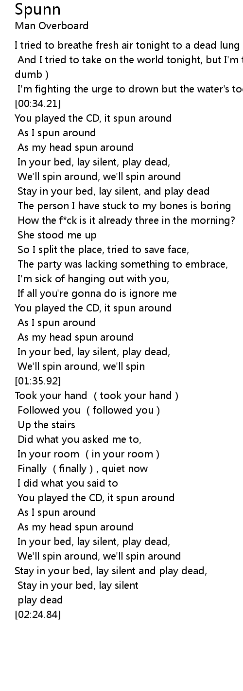 | [02:05.02] | In your bed, lay silent, play dead, |