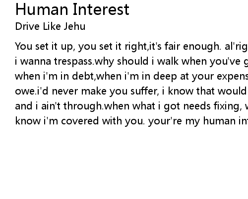 | You set it up, you set it right,it's fair enough. al'right:if i want a loan, if i wanna trespass.why should i walk when you've got wheels.when i'm in doubt, when i'm in debt,when i'm in deep at your expense.then i owe you. i owe you. i owe.i'd never make you suffer, i know that wouldn't do,and that ain't practical, and i ain't through.when what i got needs fixing, when i want something new,i know i'm covered with you. your're my human interest... |