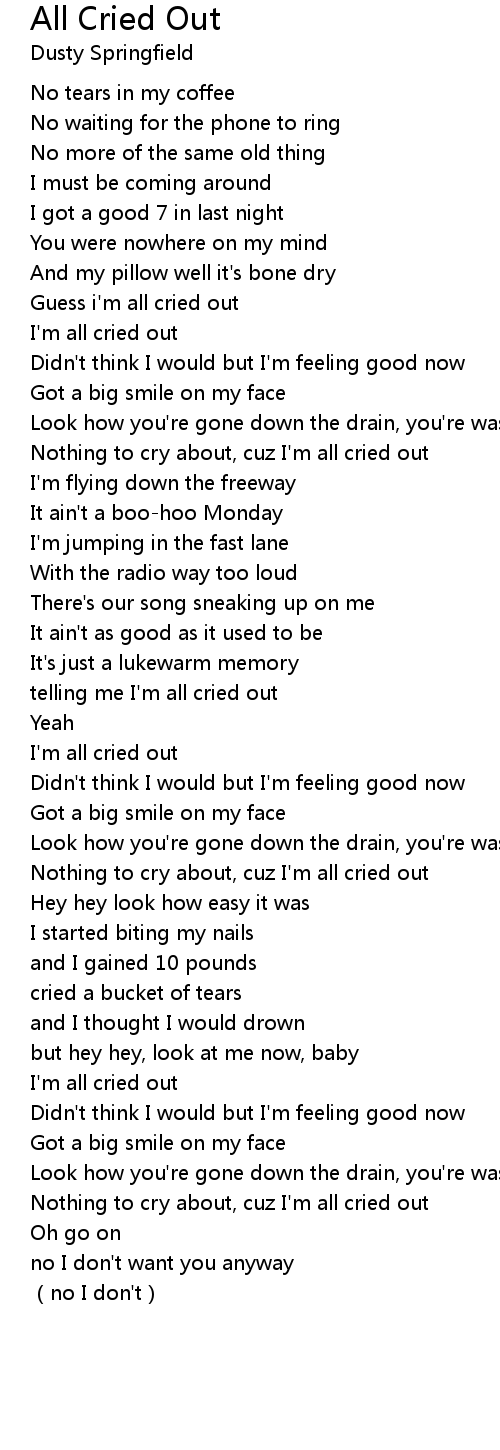 | [00:39.19] | Nothing to cry about, cuz I'm all cried out |
