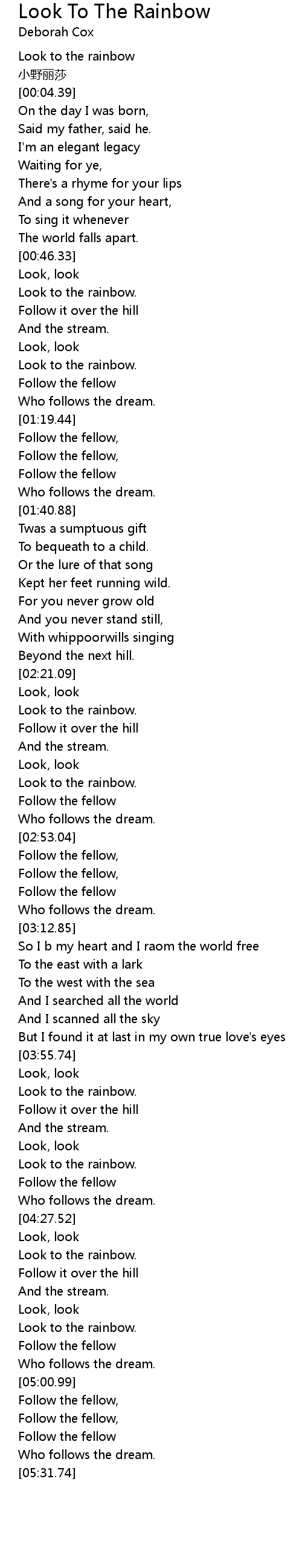 | [04:48.36] | Look to the rainbow. |