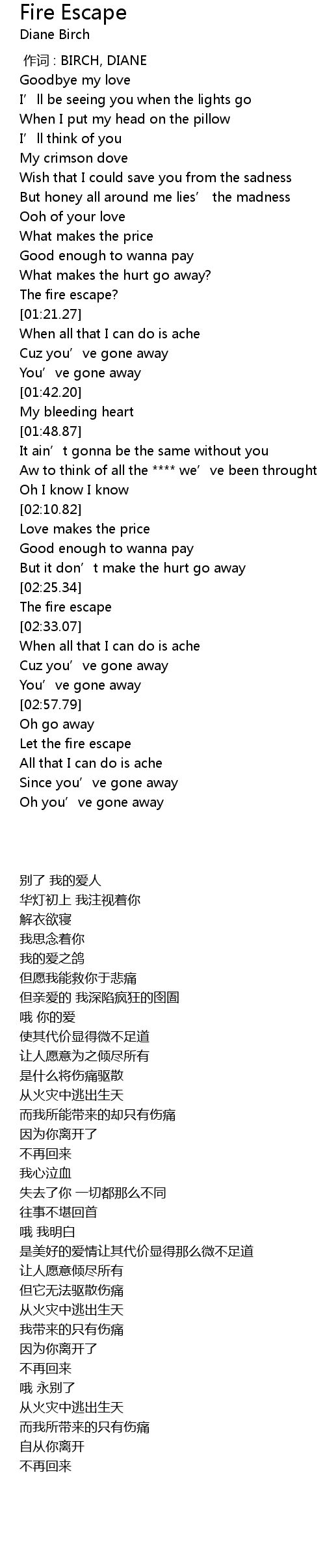| [02:31.82] | The fire escape |