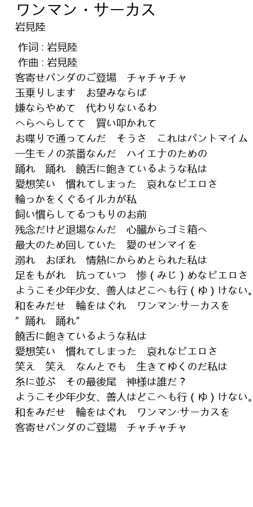 | [01:37.000] | 和をみだせ 輪をはぐれ ワンマン·サーカスを |