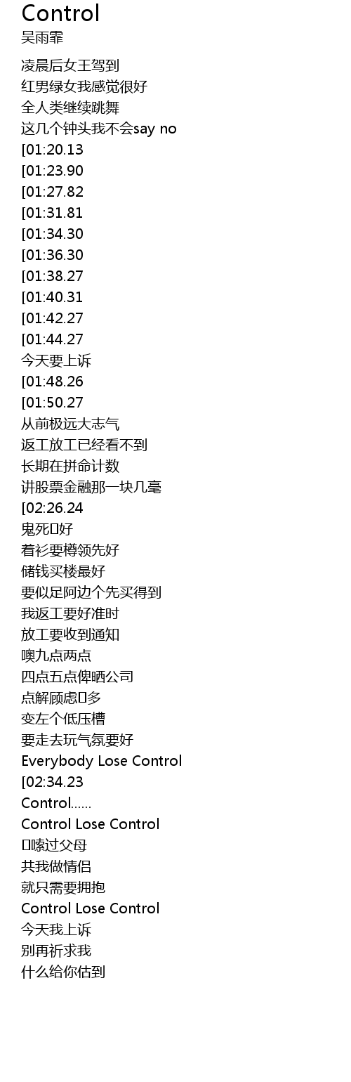 | [00:56.25][01:44.27][02:24.25][03:12.37] | Control Lose Control |