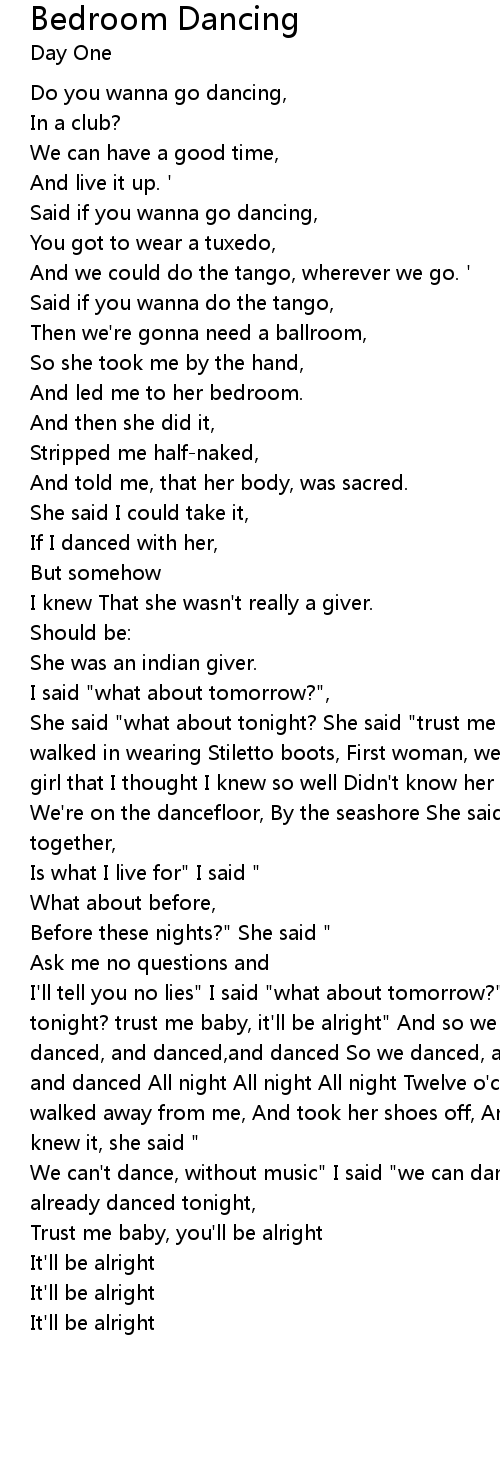 We can't dance, without music" I said "we can dance tomorrow", She said "we've already danced tonight, |