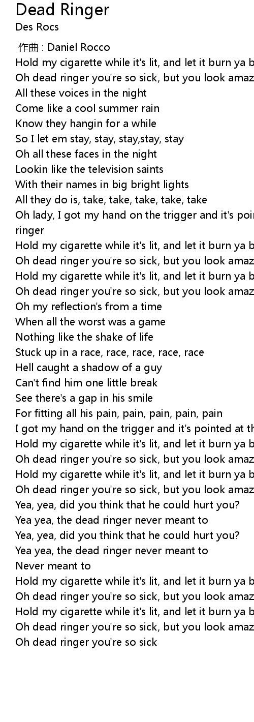 | [00:53.043] | Oh dead ringer you' re so sick, but you look amazing |