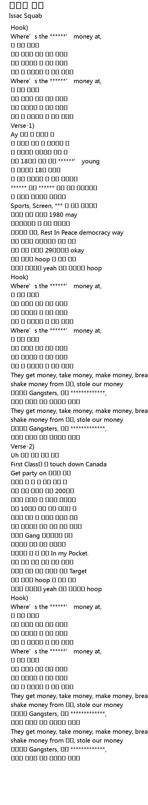 | [00:29.764] | Where’s the ******’ money at, |
