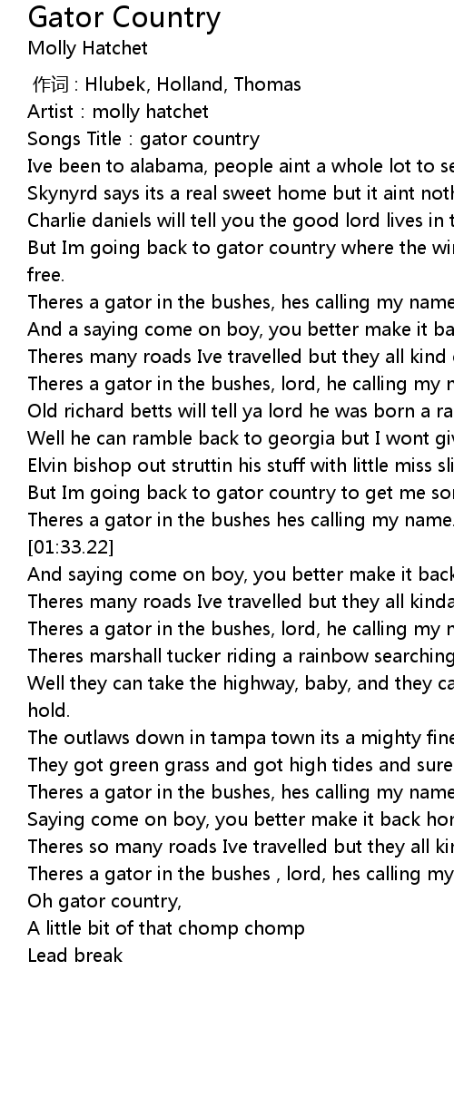 | [02:31.98] | Theres a gator in the bushes, hes calling my name. |