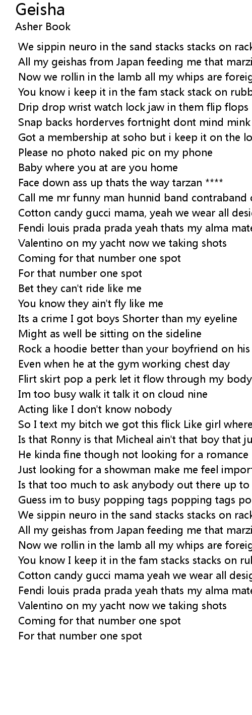 | [01:45.659] | All my geishas from Japan feeding me that marzipan |