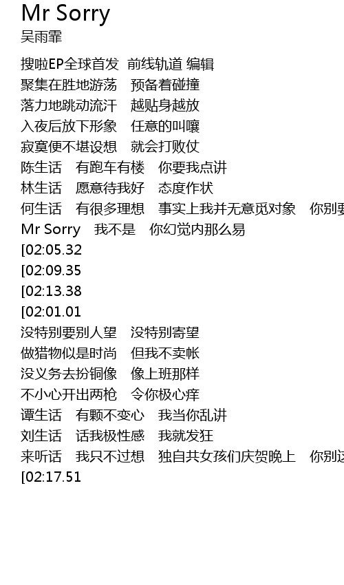 | [02:58.07][02:17.51] | Hey Mr Sorry |
