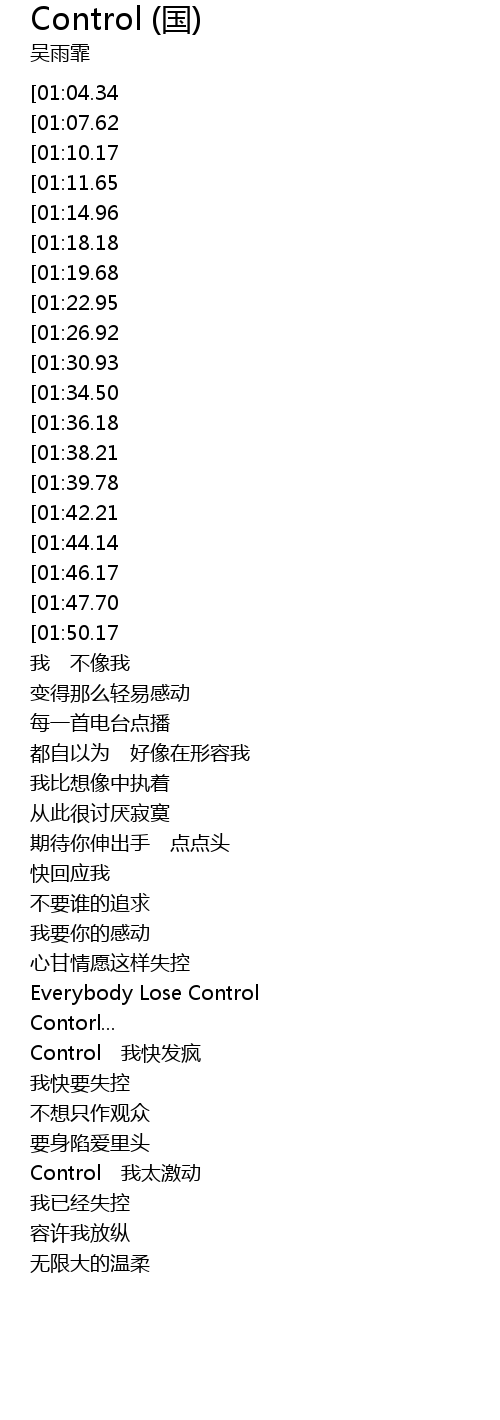 | [00:48.04][01:36.18][02:16.20][03:03.98] | Control Lose Control |