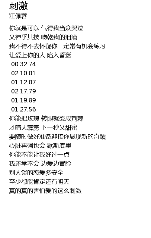 | [02:21.77][01:19.89] | 你给我的爱真的太过刺激 |