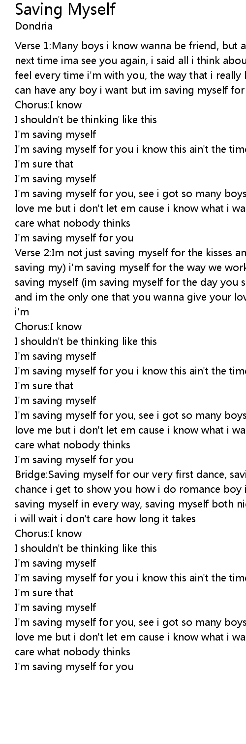 Bridge:Saving myself for our very first dance, saving myself for the very first chance i get to show you how i do romance boy i think by now you should see i'm saving myself in every way, saving myself both night and day, saving myself baby i will wait i don't care how long it takes |