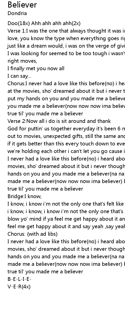 I never had a love like this before(no) i heard about it, and i seen it at the movies, sho' dreamed about it but i never thought that it was true til' i put my hands on you and you made me a believer(na na now ima believer) believer, you made me a believer(now now now ima believer) boy i never thought that it was true til' you made me a believer |