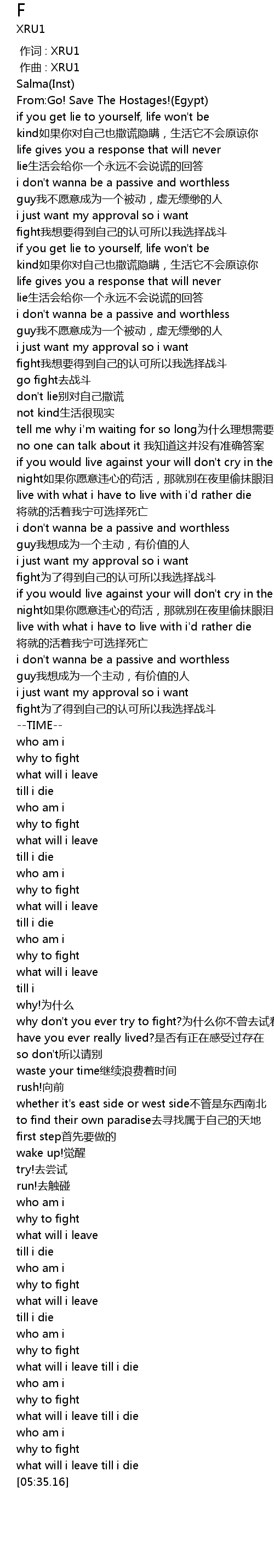 | [02:35.51] | i just want my approval so i want fight为了得到自己的认可所以我选择战斗 |