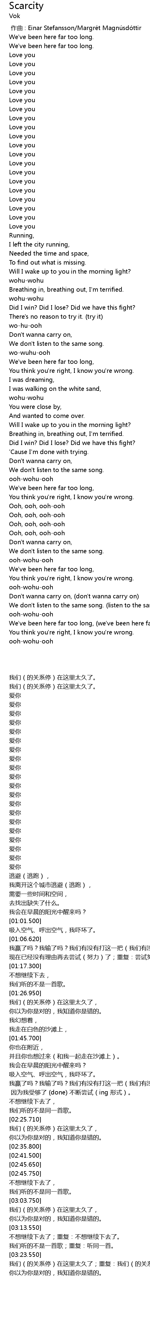 | [03:25.200] | 我们(的关系停)在这里太久了;重复:我们(的关系停)在这里太久了。 |