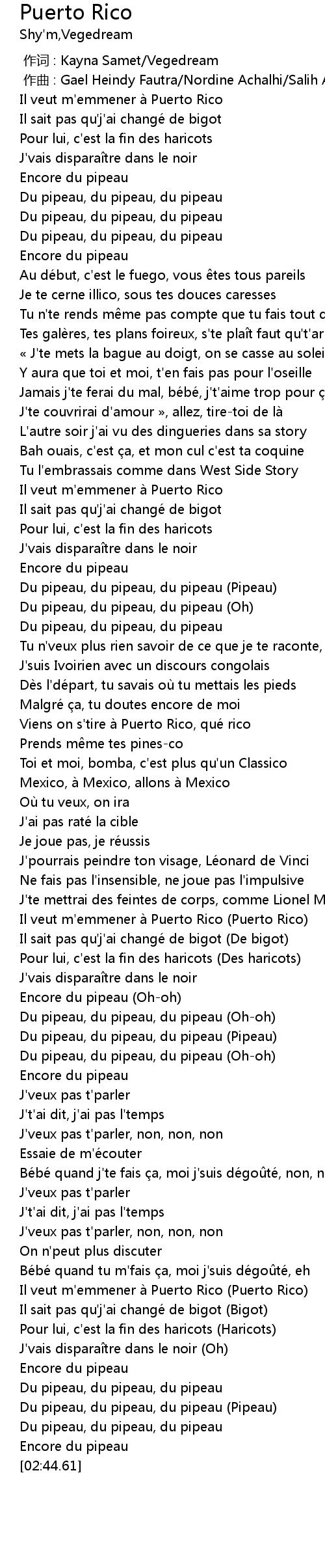 | [02:23.88] | Il veut m'emmener à Puerto Rico (Puerto Rico) |