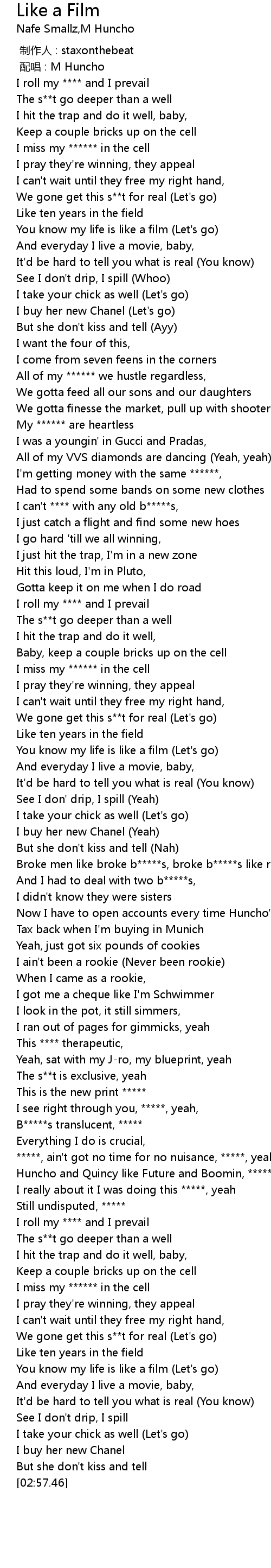 | [02:21.79] | Huncho and Quincy like Future and Boomin, ***** |