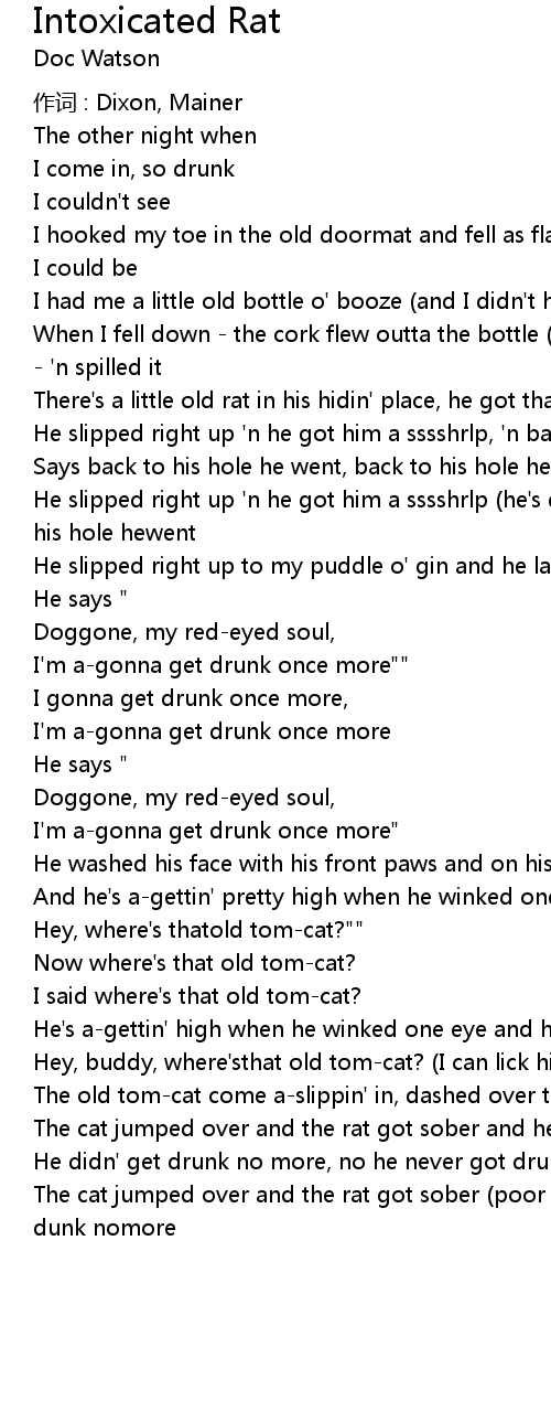 | The cat jumped over and the rat got sober poor little feller and he never got dunk nomore |
