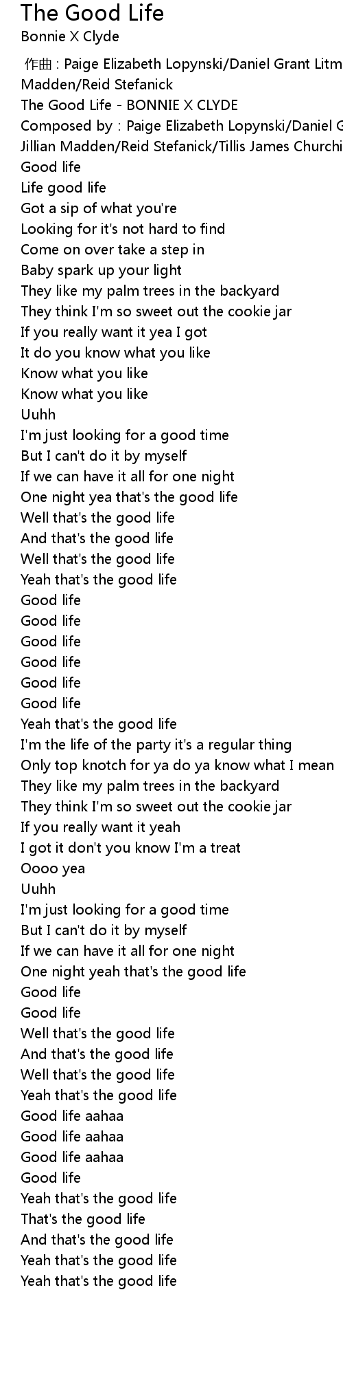 | [00:00.100] | The Good Life BONNIE X CLYDE |