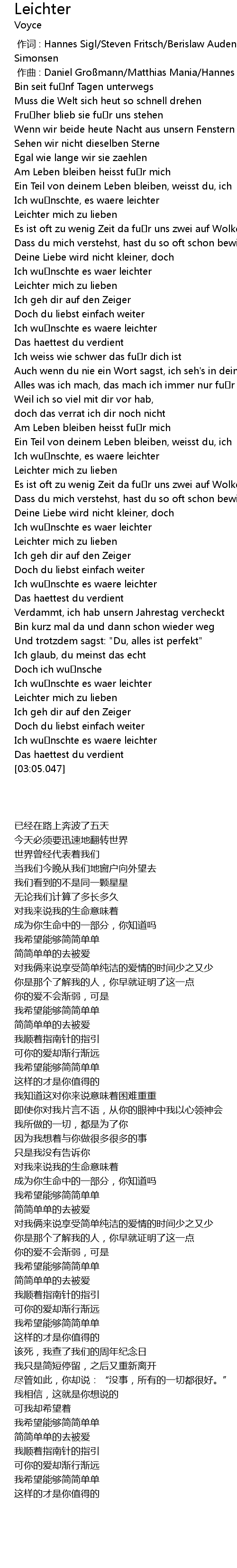 | [01:44.283] | Ich wünschte, es waere leichter |