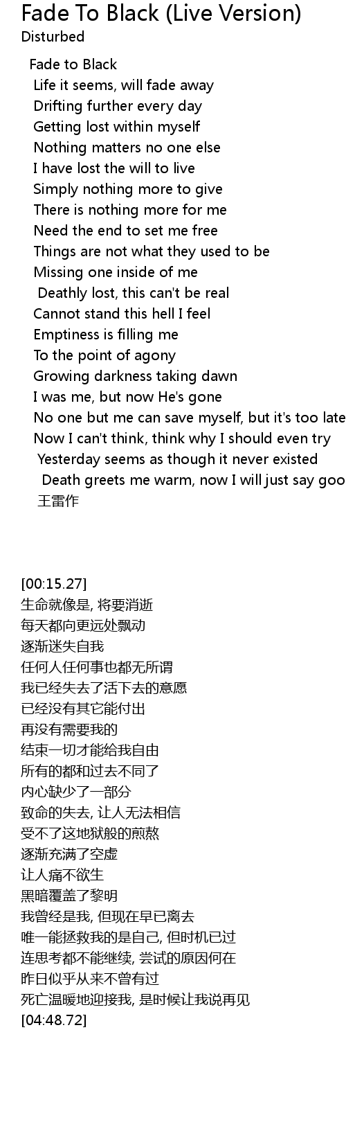 | [04:41.74] | Death greets me warm, now I will just say goodbye |