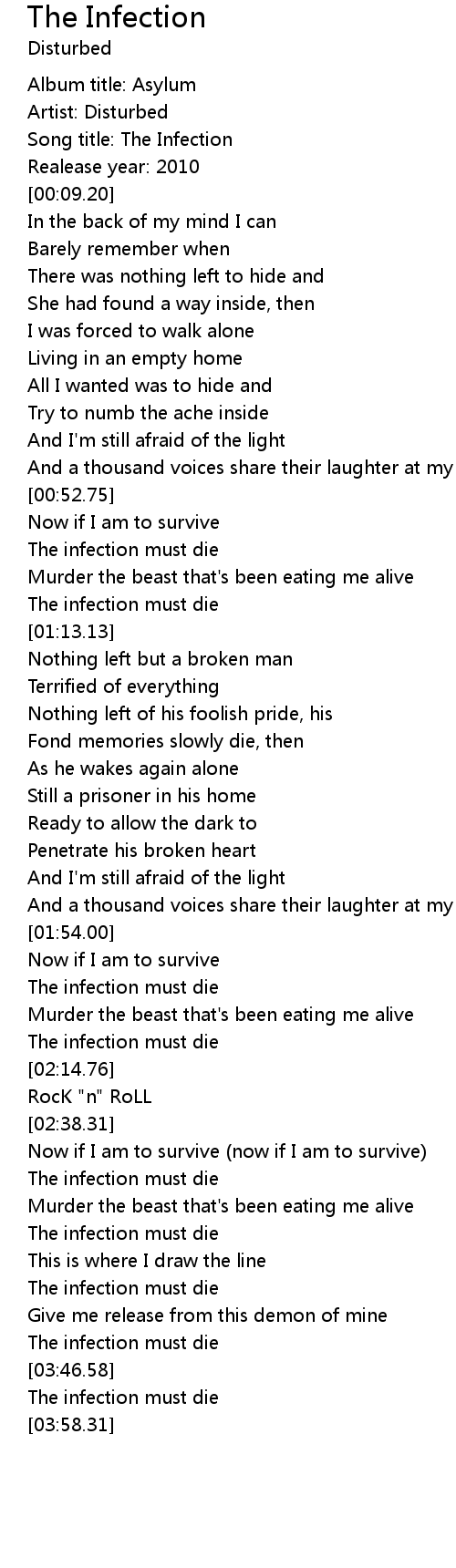| [02:00.61] | The infection must die |