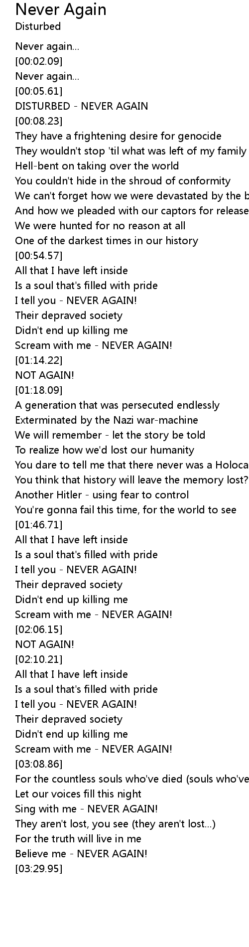 | [00:07.34] | DISTURBED - NEVER AGAIN |
