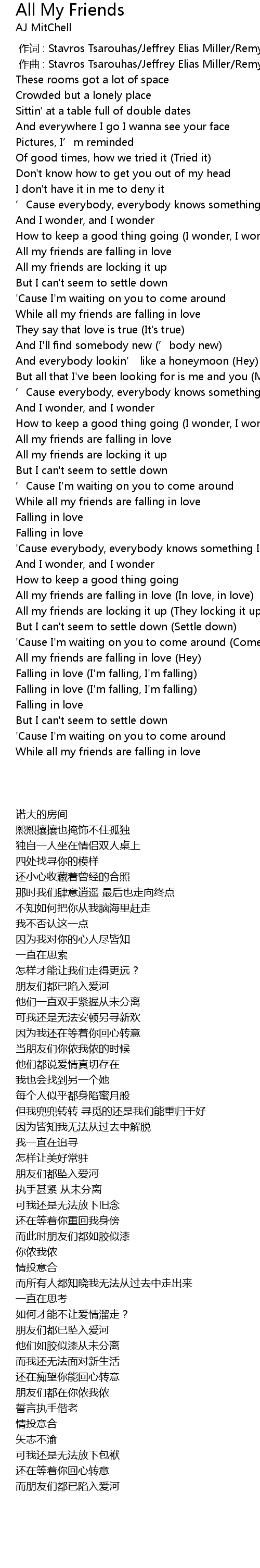 | [02:23.95] | All my friends are falling in love (Hey) |