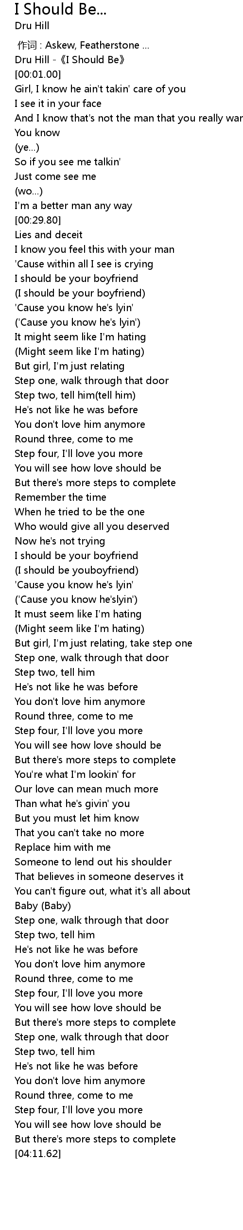 | [00:00.35] | Dru Hill -《I Should Be》 |