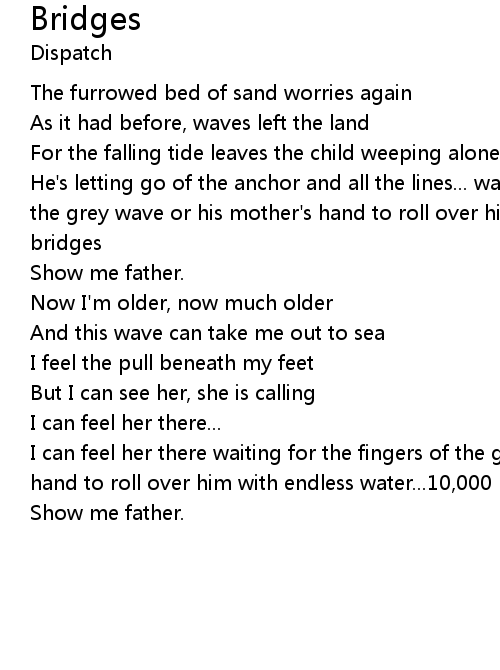He's letting go of the anchor and all the lines... waiting for the fingers of the grey wave or his mother's hand to roll over him with endless water...10,000 bridges |