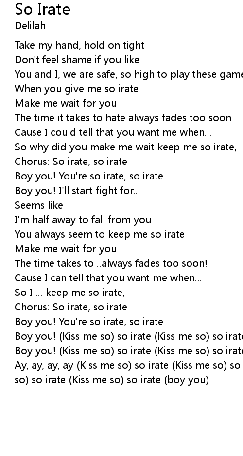 Ay, ay, ay, ay (Kiss me so) so irate (Kiss me so) so irate (boy you) (Kiss me so) so irate (Kiss me so) so irate (boy you) |