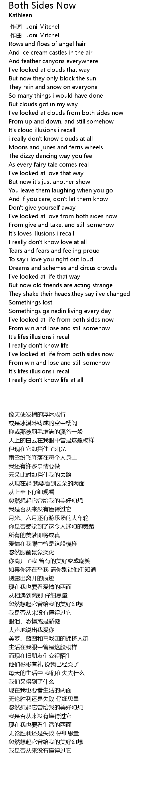 | [00:45.30] | I' ve looked at clouds from both sides now |