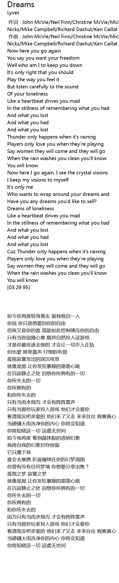 | [00:00.000] | 作词 : John McVie/Neil Finn/Christine McVie/Mick Fleetwood/Stevie Nicks/Mike Campbell/Richard Dashut/Ken Caillat |