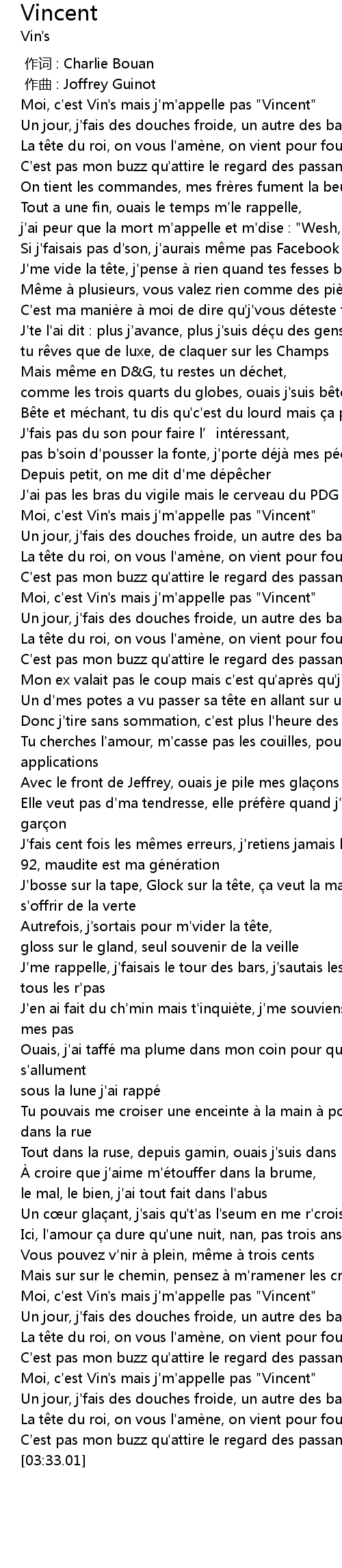 | [03:02.66] | Moi, c'est Vin's mais j'm'appelle pas "Vincent" |