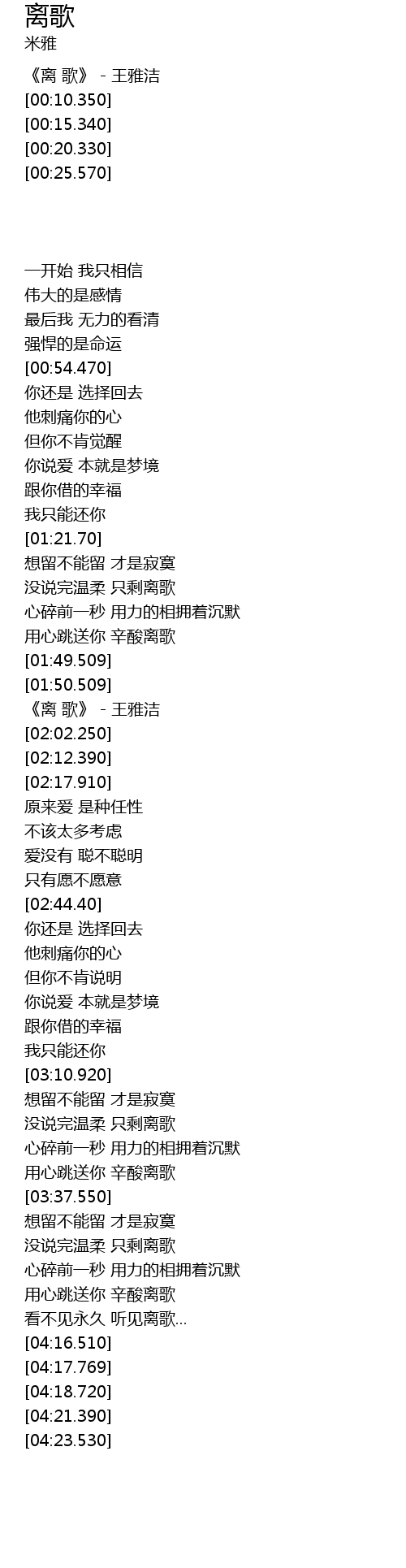 | [01:52.530] | 《离 歌》 - 王雅洁 |
