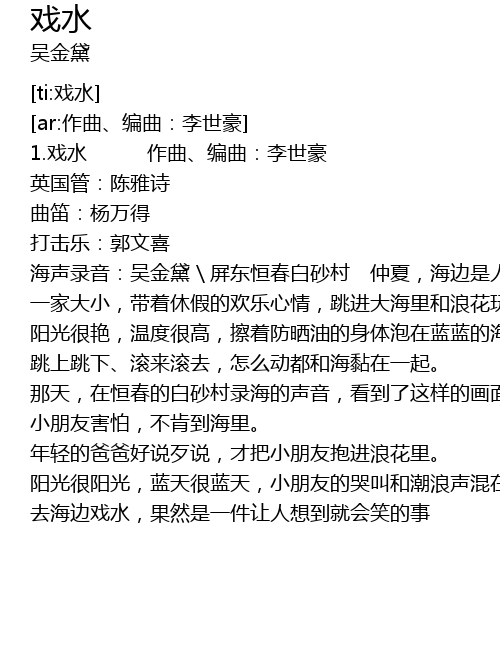 | [00:20.09] | 1.戏水 作曲、编曲:李世豪 |