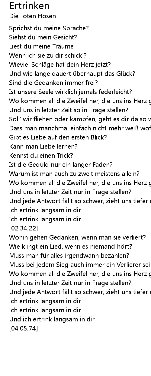 | [03:40.58] | Und jede Antwort f llt so schwer, zieht uns tiefer rein ins Meer |