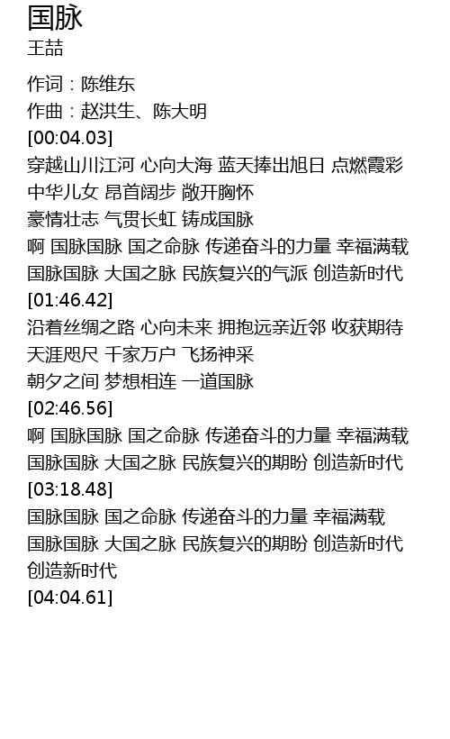 | [03:01.17] | 国脉国脉 大国之脉 民族复兴的期盼 创造新时代 |