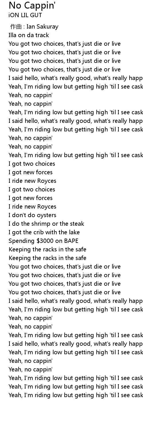| [01:48.089] | Yeah, I'm riding low but getting high 'til I see caskets |