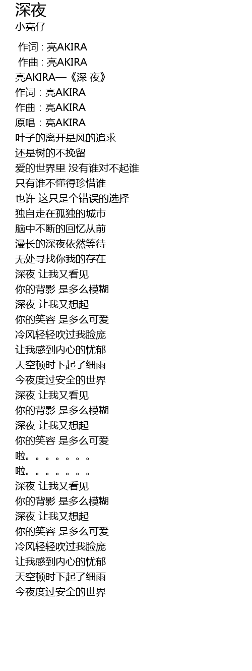 | [00:01.023] | 亮AKIRA—《深 夜》 |