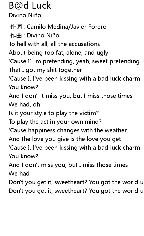| [00:44.343] | ' Cause I, I' ve been kissing with a bad luck charm |