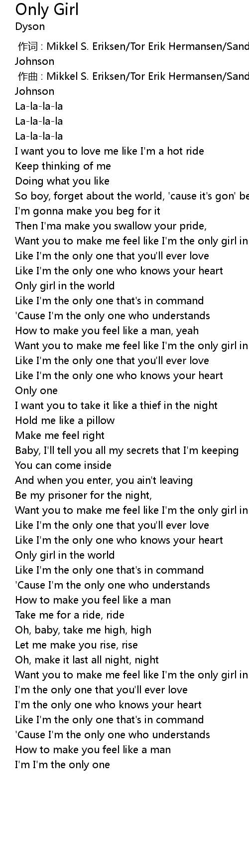 | [00:45.32] | Want you to make me feel like I'm the only girl in the world |