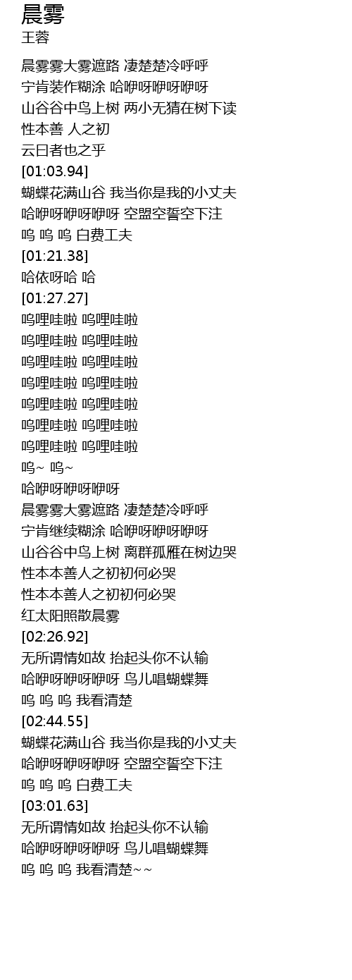 | [02:00.72] | 晨雾雾大雾遮路 凄楚楚冷呼呼 |