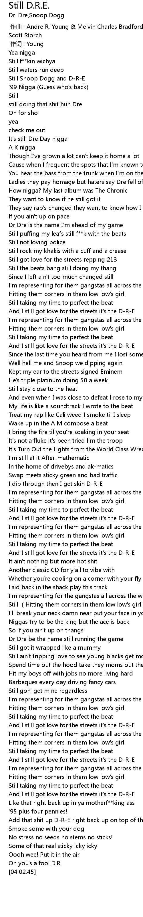 | [03:23.82] | And I still got love for the streets it' s the DRE |
