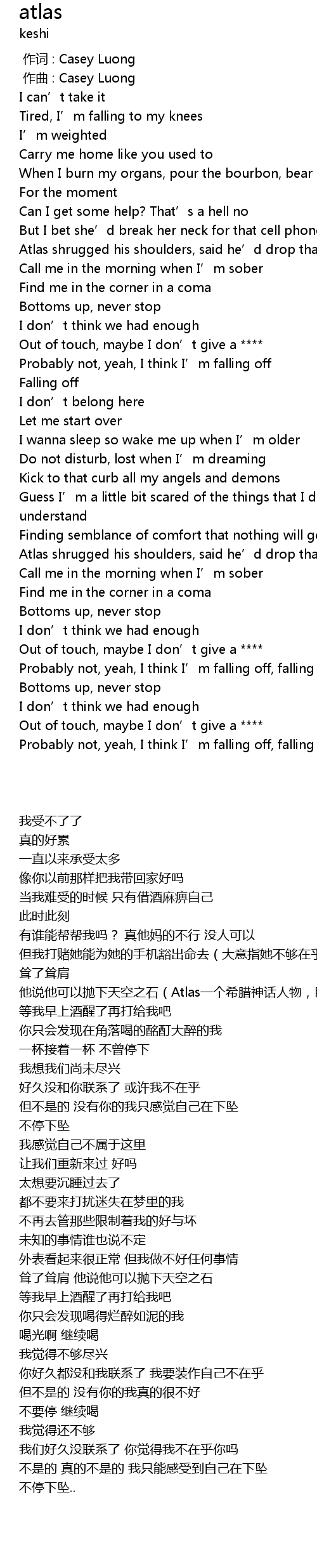 | [00:39.08] | 耸了耸肩 他说他可以抛下天空之石(Atlas一个希腊神话人物,巨人,天神。因战争失败,被众神惩罚永世用肩膀抗住天空) |
