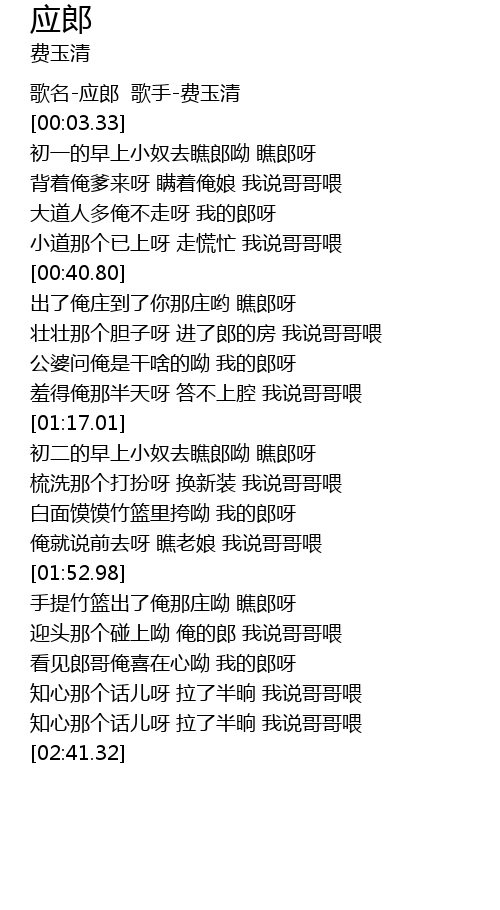 | [00:00.62] | 歌名-应郎 歌手-费玉清 |